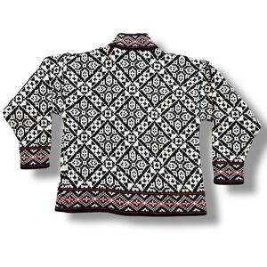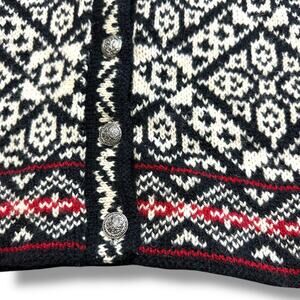 Classic heritage L.L. Bean cardigan featuring a traditional Nordic/Fair Isle pattern in black, white, and red. Made in the USA from a thick wool blend. Tmeless, cozy, Scandinavian cottage aesthetic with ornate silver-tone buttons, geometric snowflake motifs, and contrast trim at cuffs, collar, and hem. Spare button included.