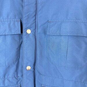 Vintage Size: M Color: blue Closure: full zip, front snap button, flap Neckline: hooded Sleeves: long, adjustable self fastener at the cuffs Pockets: 2 front, 2 chest, self fastening closures Hem: straight Chipping on the hardware Heavyweight Lined Dry Clean Recommended No holes, no stains, in great condition