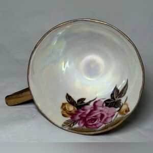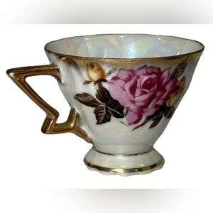This Vintage LM ROYAL HALSEY tea cup and saucer set is a rare find, featuring an opalescent pearl and pink color and a floral rose pattern. Made of fine bone china in Japan during the 1960s, this two-piece set includes a footed cup and saucer with a diameter of 3.5 inches. Perfect for all occasions, this vintage set exudes elegance and charm, making it a sought-after collectible for tea enthusiasts and collectors alike. Excellent condition. No chips or cracks.