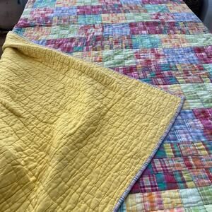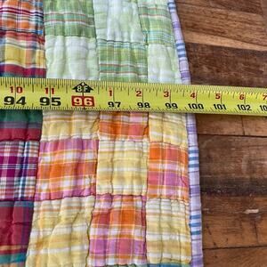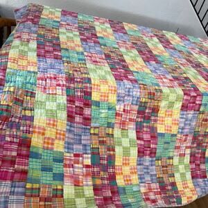 This vintage LNT Home quilt square plaid patchwork is a reversible bedding piece measuring 88" x 100". Made with 100% cotton, it features a colorful multicolor pattern perfect for all seasons. The quilt is quilted and handmade, giving it a unique and charming appeal. Perfect for adults in a bedroom setting, this vintage/retro style quilt adds a touch of cabin, cottage, and decorative charm to any home.