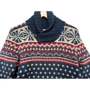 This vintage-inspired L.O.G.G. Nordic sweater showcases a timeless pattern in a wool blend, designed for warmth and style. The shawl collar and button detail add sophistication, while the medium fit ensures comfort. Crafted in Cambodia with high-quality materials, this piece is both stylish and durable.