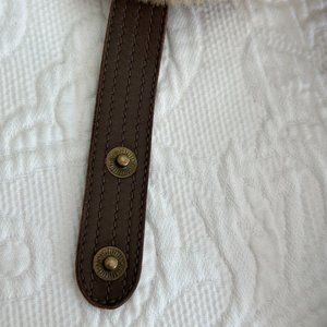 Vintage brown shearling Louis Vuitton bomber hat with tawny leather trim, snap adornments at brim and snap closures at sides.