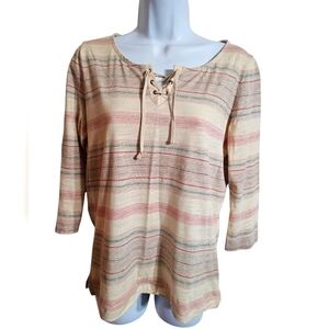 Vintage Lauren Ralph Lauren Jeans Co. long sleeve lace-up top in a soft neutral striped palette. Features earthy beige, pink, olive, and brown tones with a lightly textured feel. Lace-up neckline adds a preppy-boho twist. Perfect for transitional seasons and coastal casual looks.
