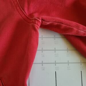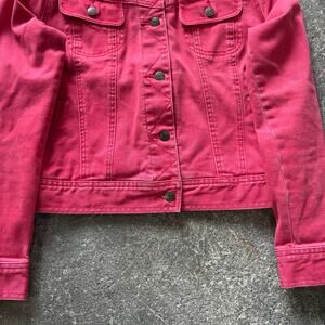 The jacket is a faded red color and has a trucker jean style.