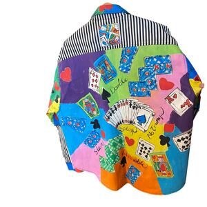 One-of-a-kind vintage LRW Designs Atlanta hand-painted button-down shirt featuring a bold playing card and bridge theme in vibrant colors. Each shirt from this brand was uniquely hand-painted, making this piece a true wearable work of art. Contrasting black-and-white stripes and hand-painted yellow buttons with blue spades complete this eye-catching collectible. Model image is AI generated for styling purposes. Actual blouse for sale is in other photos.