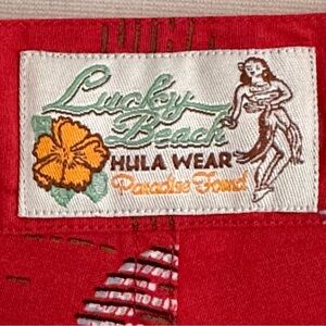 Channel retro island vibes with these rare vintage Lucky Brand “Lucky Beach” Hula Wear pants, part of the limited Paradise Found collection. Featuring a bold red base with an all-over tropical print of bamboo, lanterns, and cherry blossoms, these lightweight rayon lounge pants blend classic 1950s tiki style with Lucky Brand’s signature relaxed spirit.