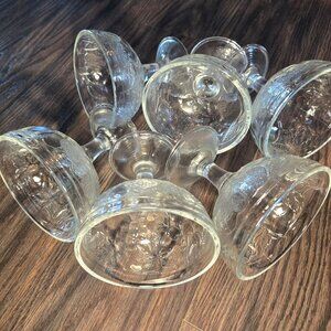 Wonderful set of six (6) vintage (70s) LUMINARC (France) glass dessert cups. Each cup is embossed with a raised fruit and leaves pattern of grapes, apples, strawberries, pears. Exquisite quality and condition. Very thick glass...well-known in vintage glass items. DIMENSIONS: 5" tall x 5" wide x 3" depth. Pedestal bases are ribbed.