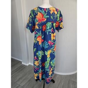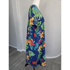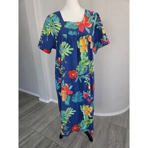 Vintage La Cera Cotton Tropical House Dress Muumuu Medium Blue Floral Sz L