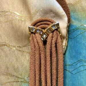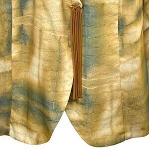 This sheer vintage piece quietly sings a song of sartorial elegance. Featuring an abstract allover print in tan, green and gold with fringe detail on the front.