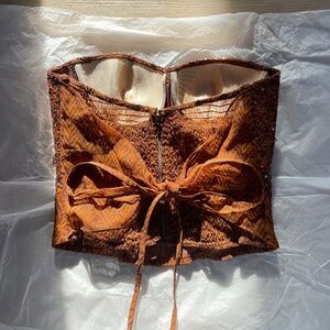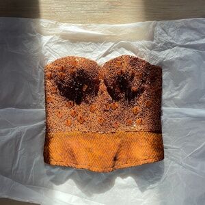 Gorgeous vintage La Perla bustier top in a lush brown. Intricate layered detail including tortoiseshell paillettes, sequins, and silk chiffon ties at back. In great vintage condition, made in Italy. Size tag removed but best for a s/m with a b cup, stretch material at back allows some give.