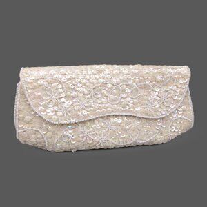 Vintage La Regale Sequin Beaded Evening Bag Clutch in Original Box. The color is iridescent with yellow white shades. It measures approximately 9 by 4 inches. It comes in its original box with tissue paper. The bag is in good shape and is so pretty. Please view all photos for condition and details. The box has some wear.