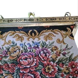 Vintage Tapestry Purse with Black Embroidery. The tag reads La Regale made in Hong Kong. The black silk lining is in excellent condition with no rips or tears. Metal Gold Toned Frame with Ball Snap Closure Small bent damage with stain sold as is. The metal chain handle measures 8" X 6". Very good vintage condition! Make an offer!