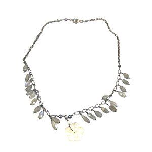 This exquisite vintage necklace features a delicate chain adorned with labradorite beads and an elegant mother-of-pearl flower pendant. At 16 inches in length, it offers a refined and sophisticated look, perfect for adding a touch of elegance to any ensemble. The lobster clasp ensures secure wear.