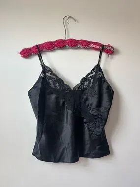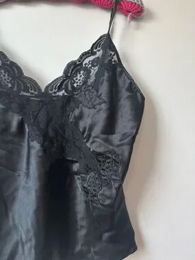 Vintage black silky lace cami top with lace neckline and floral embroidery. Tag cut out but looks to be Victoria’s Secret gold label.