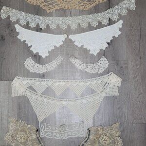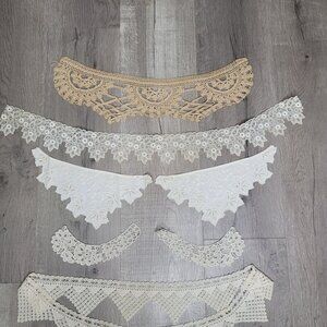 This collection features an exquisite assortment of vintage lace collars and trims, meticulously crafted with intricate patterns. Ideal for enhancing garments, accessories, or home decor projects, these pieces offer a timeless elegance. The set includes seven unique designs in delicate beige and white hues, perfect for adding a touch of vintage charm.