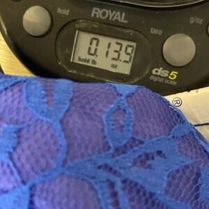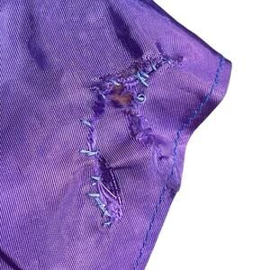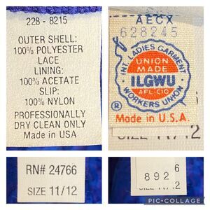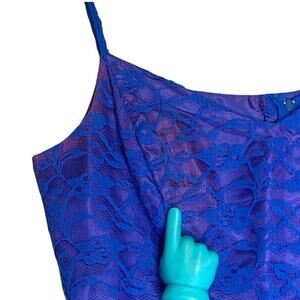 She does have some discrete flaws but nothing that you’ll feel the need to hide. She has some discoloration at the bottom hem and someone Frankensewed a hole in the purple slip (at the hem) which is hidden well behind the blue lace. She also has a discolored spot up top on the front and discoloration on the under arms. None of these flaws stand out when worn and all are noted in photos. She’s in otherwise great vintage condition.