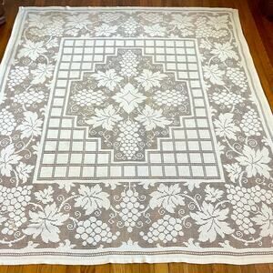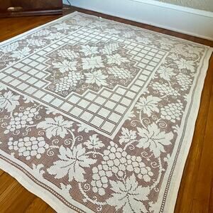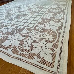 This tablecloth is crafted from lace and features a rectangular shape with a grape and leaf motif. Its vintage cottagecore style is highlighted by intricate lacework and delicate craftsmanship, making it a charming addition to any dining room. Suitable for special occasions such as dinner parties or family gatherings. The tablecloth is pre-owned.