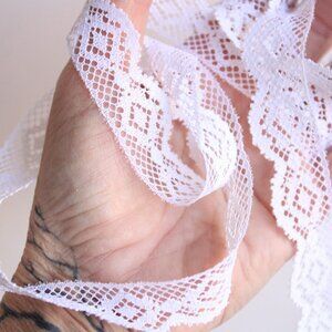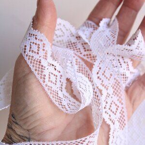 Vintage lace trim in snow white. 7/8" at the widest. Very pretty and feminine! Perfect for headbands, bridal, chokers and more. Listing is for three continuous yards. Looks and feels like nylon or blend.