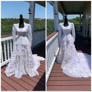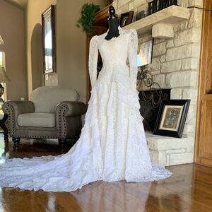 Vintage gorgeous victorian styled wedding dress Union Label ILGWU tag made in USA the bounce covered in lace with embroidery lace appliqués and beads zipper back closure small bow (zipper does work, dress is too small for the mannequin) layers of lace and sheer fully lined (dress is vintage some discoloration on lace appliqué and train few faux beads missing from collar, minor hole on train color may vary due to lighting) otherwise it’s in great preloved condition smoke/pet free home