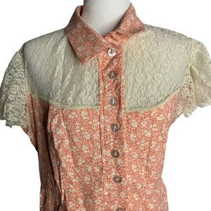 Vintage Lace Yoke Mini Shirt Dress Womens M Pink Floral Country Western