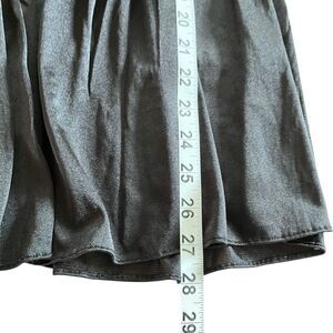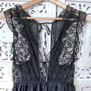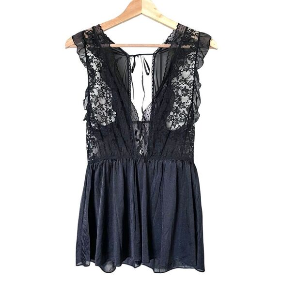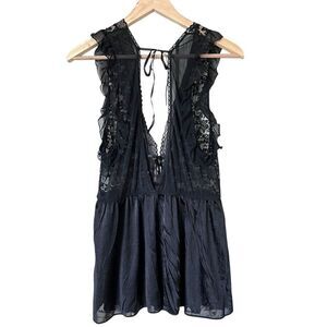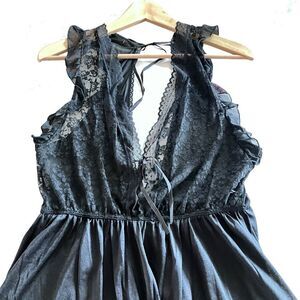 Black satin like lingerie top with lace trim and ties at back. In GUVC