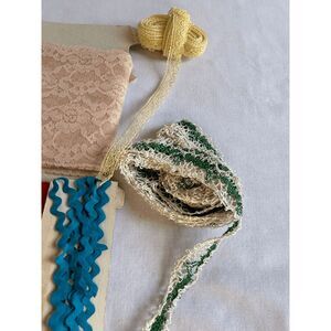 This is a lot of vintage lace and other sewing items related to lace. I have not measured anything, so what you see is what you get. There are also pins stuck in the lace. I think some is cotton and other polyester.