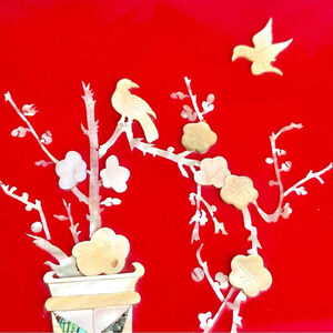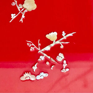 Amazing red lacquered box with mother of pearl and abalone inlay of birds and flowers. This does have some wear to the red (see pics) and a black mark on the bottom. 9.5x12”