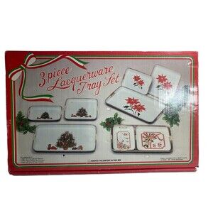 Vintage Lacquer Ware Tray Christmas MCM Tree Angel Presents Candles 3-piece set made in Japan