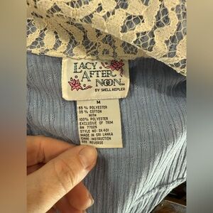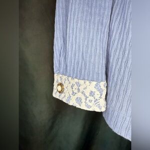 This adorable vintage shirt by Lacy After Noon features a soft blue fabric with delicate lace and floral accents, perfect for a feminine, nostalgic look. The lightweight material, a blend of 65% polyester and 35% cotton, gives it a comfortable and breathable feel, while the lace trim adds a touch of elegance to the front, sleeves, and collar. The button-down front features gold-tone floral buttons and a flattering adjustable drawstring waist for a cinched silhouette.