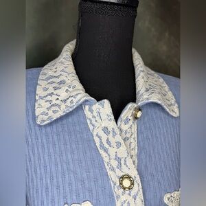 Vintage Lacy Afternoon Blue Button-Down Shirt with Lace & Floral Details