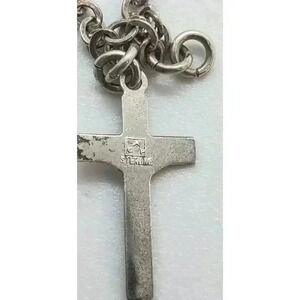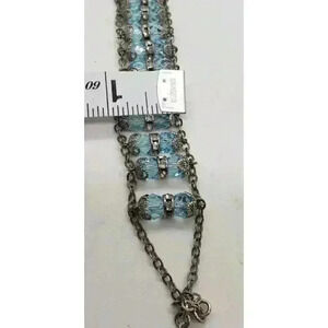 A beautiful vintage bracelet in 925 sterling silver, made in a ladder style. Chains run along the outside edge and the center "rungs" of this ladder are blue high quality round faceted crystal beads with sterling filigree end caps and between the 2 beads is a circular disc with clear rhinestones set into the edges. Slide closure and someone has added a vintage sterling cross.