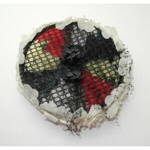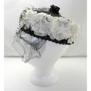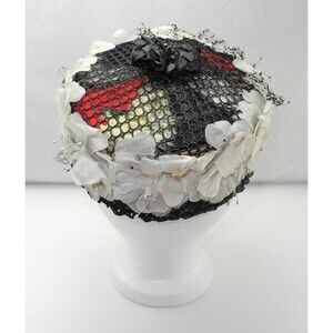 Vintage pillbox hat has feathers, flowers and netting and is in very good condition. Black woven base with white flowers all around and black netting across the top. Under the netting and rigid honeycomb weave are feathers. The feathers are red, white, black and pale yellow with a touch of green. The top also has a small black woven bow. There is black netting attached, shown in pictures, it has holes in it. The hat is lined with velvet and cotton. The inside diameter is 21, it measures 7-1/4 across and 2-3/4 high. Please consider that this is a vintage item, the hat has been worn and is not brand new. You are buying it as is.