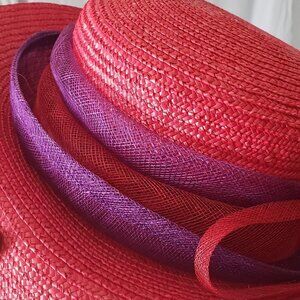 Vintage Ladies SOMETHING SPECIAL Red Hat Society Woven Straw Cartwheel Shaped Hat w/Purple accent around the band.