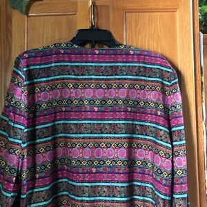 This vintage jacket from Lady Carol of New York is a beautiful addition to any wardrobe. The pink floral stripes create a unique and eye-catching pattern that is perfect for any occasion, whether it be a party, casual outing, or formal event. With an open closure and lightweight fabric, this mid-length jacket is a comfortable and stylish choice for the warmer seasons of spring and summer.