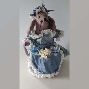 She is wearing a blue dress with Matching Apron and hat. She is also wearing glasses.