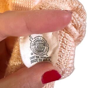 Light pink vintage oversized sweater with circles and grid pattern. Couldn't find the size, but it fits a size medium a little oversized or a tighter large (see measurements). Lady Devon brand and ILGWU tag. Made in the USA.