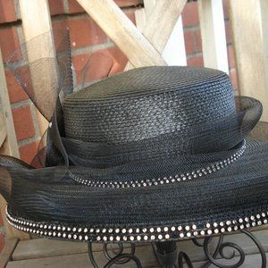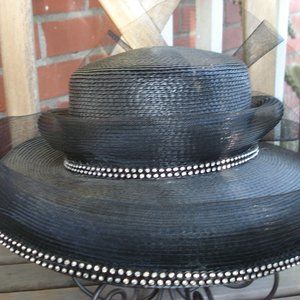 Pretty lady hat in a black = no brand. This hat is vintage and in good condition and very clean. There are a few glitter stones missing, but can be easily added to it. Please contact me with any questions you might have, thank you!!!