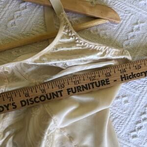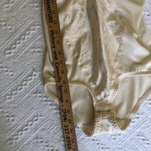 Keywords: vintage shapewear, body briefer, all in one, bodysuit, control, tummy control, satin jacquard, beige nude, adjustable straps, snap crotch, ILGWU, made in USA, 36C, 1970s, 1980s, Lingerie