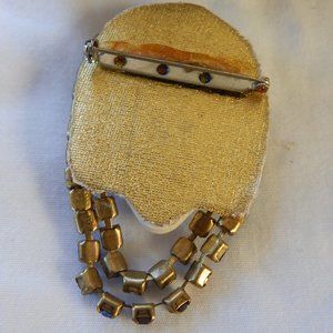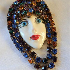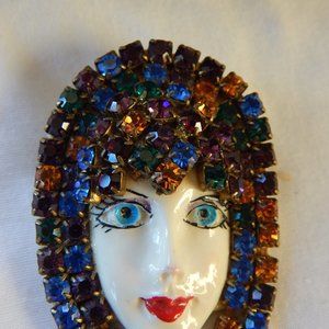 This is a fun little vintage pin. Someone did a nice job putting this together. The face is hand painted on a solid plastic face and she is embellished in a multitude of colorful rhinestones that not only form her headpiece, but fall past her chin. The backing is a gold material and there is a working pin. She measures 2 3/4 long counting the falling rhinestones and 1 1/2 inches wide.