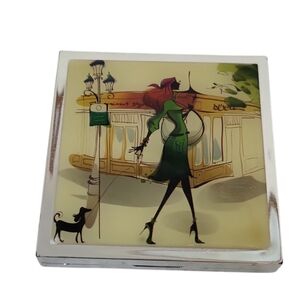 Featuring a delightful design of a stylish lady walking her dog, this double-sided mirror combines elegance with practicality.