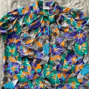 Vintage Lady Winn Necktie Bow Button Up Long Sleeve Bold Floral Print Blouse 1X