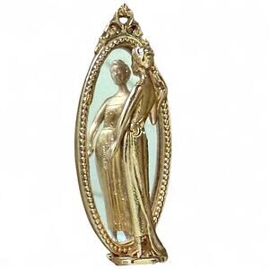 This vintage gold tone brooch features an elegant woman looking into a mirror within an oval shaped mirror, perfect for adding a touch of glamour to any outfit. Made in the United States in the 1980s, this pin showcases a beautiful Art Deco Nouveau design that exudes beauty and fashion. The combination of glass and metal materials add a luxurious touch to this unique piece, making it a stylish accessory for women who appreciate vintage jewelry.