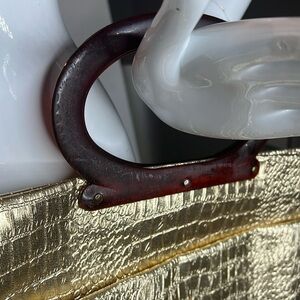 This is a beautiful Vintage Lady's Pride Vintage Lady's Pride Gold Croc Embossed Folding Lucite Double Handle Tote Bag Excellent pre owned condition. Slight wear to one of the. Bakelite double oval handles. No other issues. 15” (8.75” when folded) x 12.75” No odors. No stains.