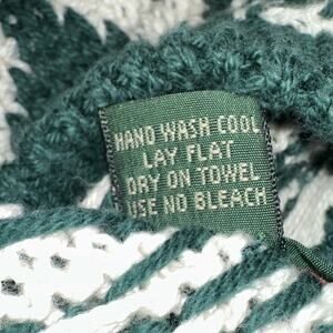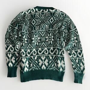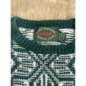 Authentic vintage Lake Harmony Rowing Club sweater in green and white with bold geometric knit patterns. Crewneck, ribbed cuffs and hem, and soft mid-weight cotton blend knit. Made in USA – quality craftsmanship with a rare rowing club graphic tag.