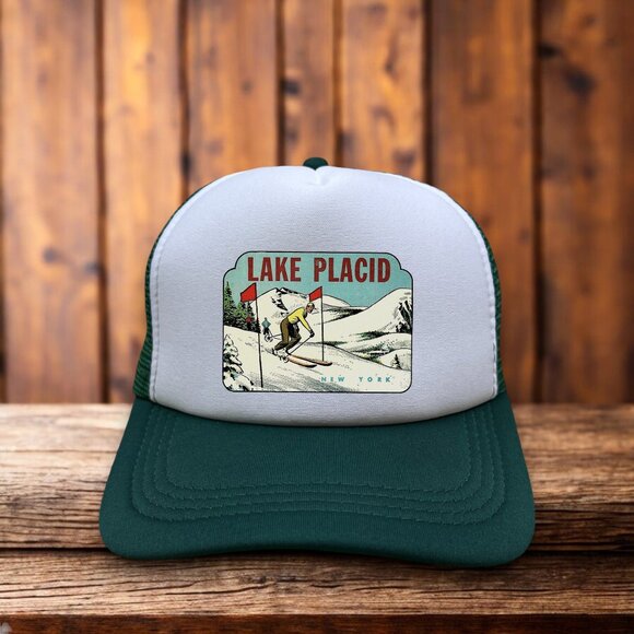 Vintage Lake Placid New York Mens Trucker Hat Green Snapback Skiing Baseball Cap