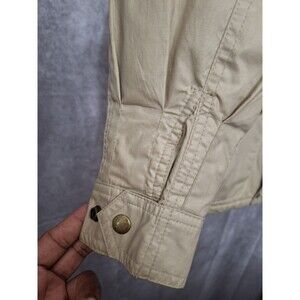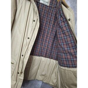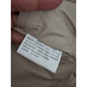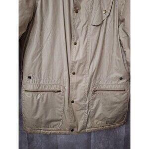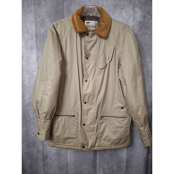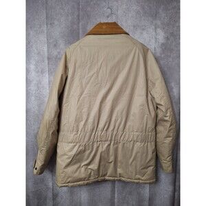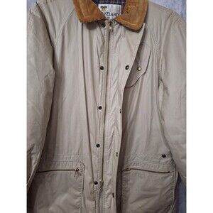 The Vintage Lakeland Chore Jacket is a timeless piece perfect for colder seasons, featuring a sturdy cotton blend outer shell with a corduroy collar for added style. This mid-length jacket offers both practicality and fashion, with features like inner and zipped pockets, insulation, and water-resistant properties. The beige color and classic design make it versatile for various occasions, from casual outings to workwear or travel. Made by Lakeland, this jacket combines a retro vibe with modern functionality, making it a stylish addition to any wardrobe. HAS SOME STAINS ON ONE SHOULDER AREA. PTP 22 in. Length 31.5 in. Sleeves 26 in.