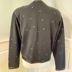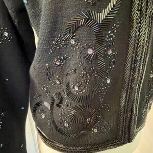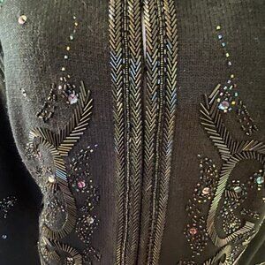 Liz Claiborne vintage lambswool blend cardigan. Beaded on front and back with several different bead and sequin styles. Size small, Condition: Excellent Condition, no stains or tears. the top knot button shows slight wear and two of the front hood and eye closures need restitching to be secure. Fully lined, well made vintage sweater. Looks equally good worn open as well. 54% lambswool and 46% acrylic.