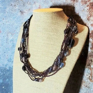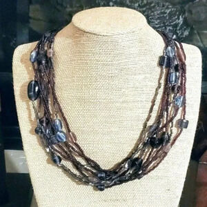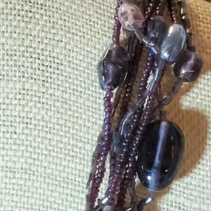 Handcrafted Purple Shades Vintage Lampwork Glass Beads Multistrand Necklace Handmade multi-strand necklace Edgy contrasting shades of purple, lavender, and other shades Made with vintage India glass lampwork and tumbled glass beads Finished with vintage sterling silver plated brass round beads, lobster claw clasp, and extender chain Measures about 18 long overall not including extender Size: OS