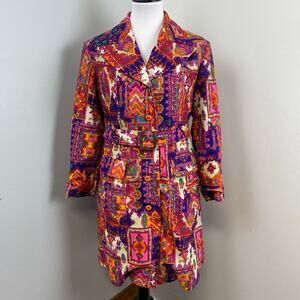 This bright, multi-colored coat has a psychedelic, mod, and bohemian aesthetic. The print features a mix of intricate, decorative patterns reminiscent of paisleys, tapestries, and floral designs. The style of the coat, with its structured collar and button-down front, is characteristic of the "mod" fashion of the era, while the bold, vibrant patterns are associated with the psychedelic and bohemian movements. It has matching belt. The jacket is made of a soft knit.