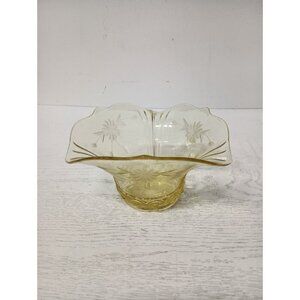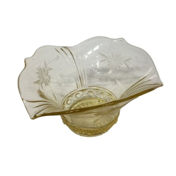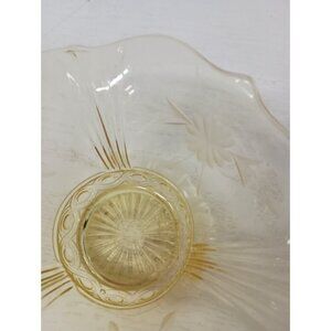 Vintage Lancaster Yellow Depression Glass Serving Bowl Etched Flower Ruffle Edge